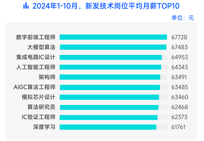 2024 年 1 - 10 月,新发岗位平均月薪 TOP10 的技术岗位里,大模型相关岗位占了一半,数字前端工程师更是以 6.78 万元的平均月薪独占鳌头。在应届生就业市场,算法工程师等技术岗位备受青睐,人工智能相关岗位在高薪 TOP10 中占据 8 席,机器学习岗位以 47569 元的平均月薪领跑。