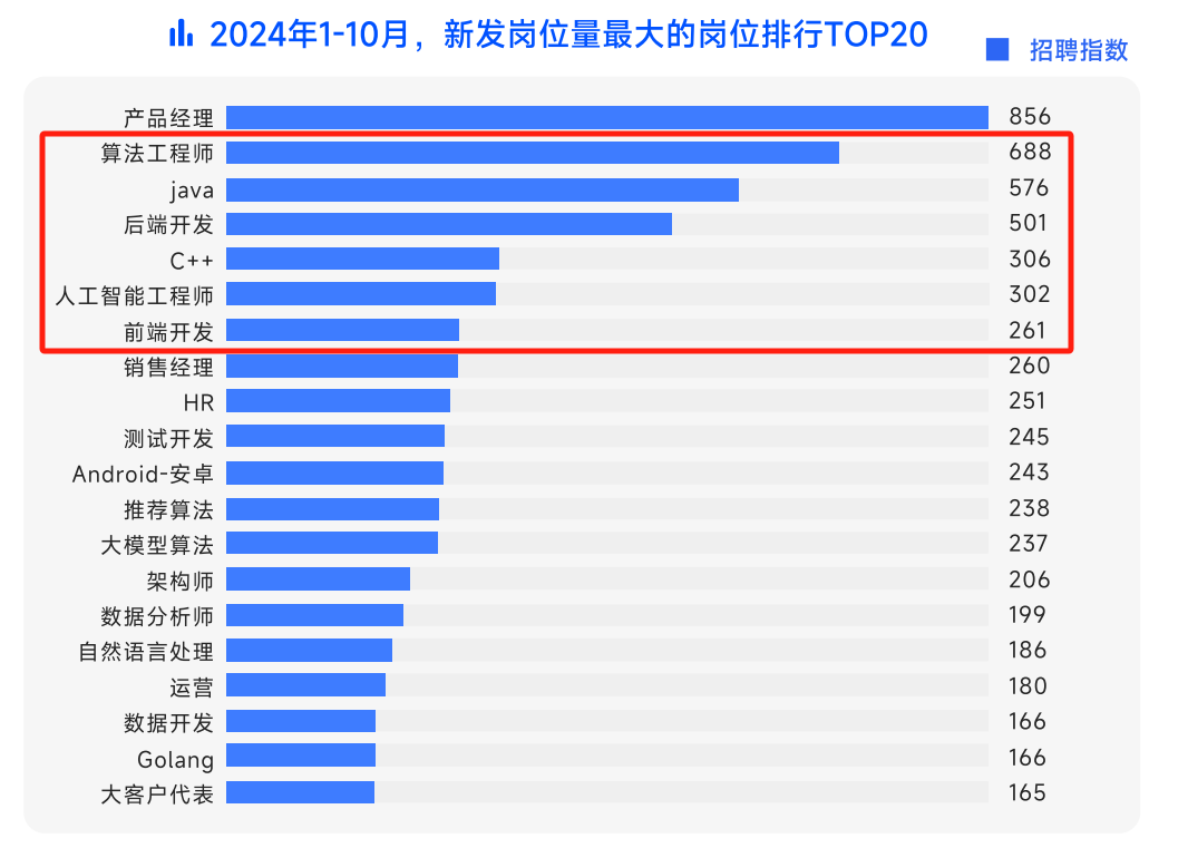 2024 年,AI 相关岗位需求持续火爆,在脉脉高聘发布的《2024 年度人才迁徙报告》 里,TOP20 新发热招岗位中,算法工程师、人工智能工程师等 5 个岗位都和 AI 紧密相关。各类开发岗位也不甘示弱,java、后端开发等同样位列热招前列。