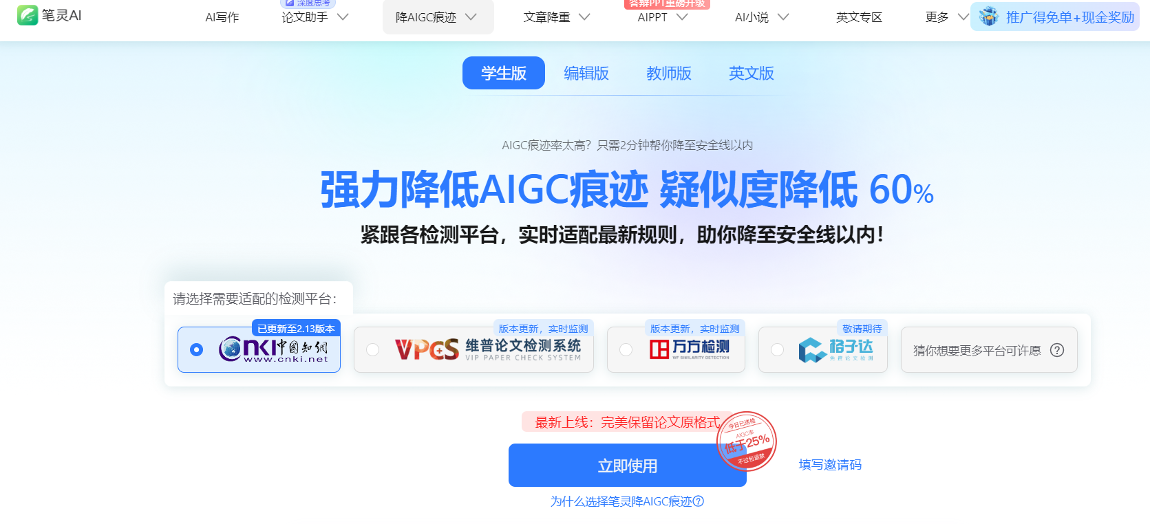 功能:提供智能降AIGC选项,以降低AI率。 支持适配知网等多个国内主流检测平台。