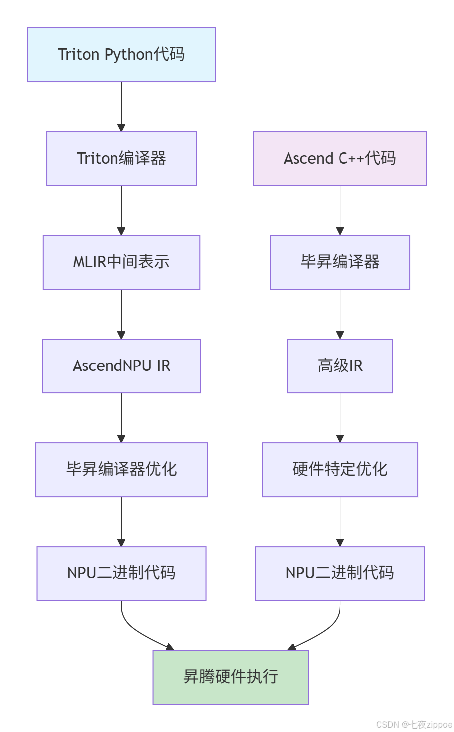 图1:Triton与Ascend C编译流程对比。Triton通过多层中间表示实现硬件无关性。