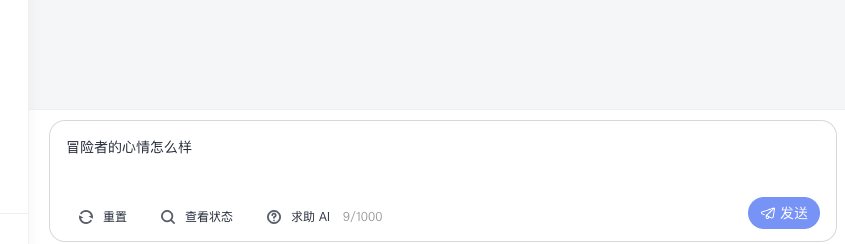 ><template #extra><div class="sender-actions"><div class="quick-btns"><d-button icon="icon-refresh" @click="resetGame">重置</d-button><d-button icon="icon-search" @click="checkBag">背包</d-button></div><div class="char-count">{{ inputValue.length }}/1000</div></div></template></McInput>