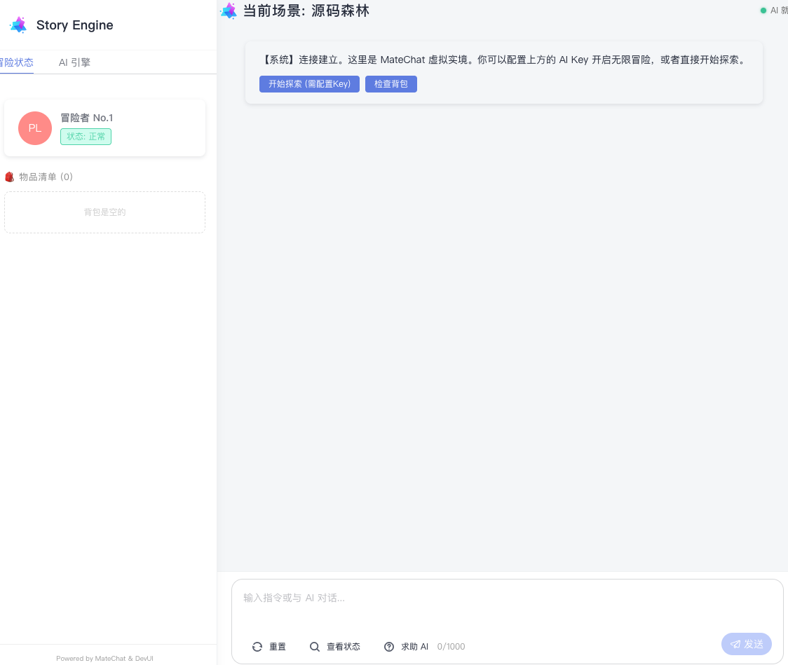 我将带大家打破常规,利用 MateChat 强大的组件能力,在纯前端环境下构建一个“轻状态”叙事引擎。完整代码我已经放到了 GitCode 仓库: https://gitcode.com/kaminono/MateChatStoryEngine ,大家也可以直接点这个 https://mate-chat-story-engine.vercel.app/ 实际上手玩玩看!
