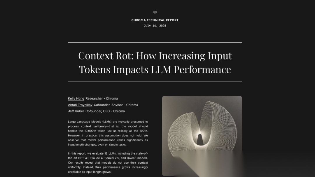 Kelly Hong 的研究则为「长上下文万能论」敲响了警钟。她提出了「上下文腐烂」现象:随着输入上下文的增长,尤其是在存在模糊信息和「干扰项」时,大模型的性能会显著下降,甚至在简单任务上也变得不可靠。这证明了精巧的上下文工程和精准的检索比简单粗暴地填充上下文窗口更为重要。