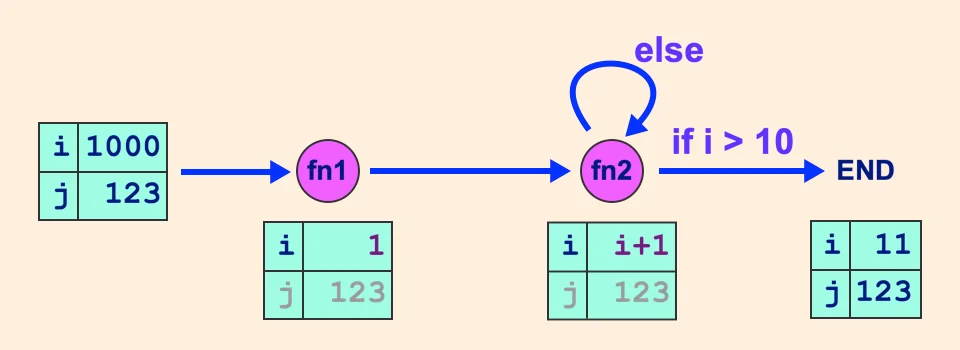 def fn1(state: MyState): print(f"Enter fn1: {state['i']}") return {"i": 1}def fn2(state: MyState): i = state["i"] return {"i": i+1}