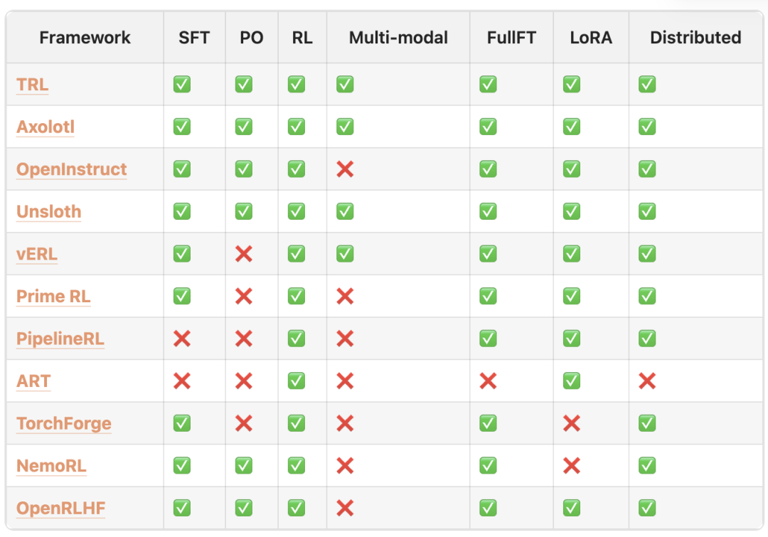 文章总结了一些主要的框架在后训练各环节中的支持范围,涵盖从监督微调到偏好优化,再到强化学习等核心领域的能力对比。