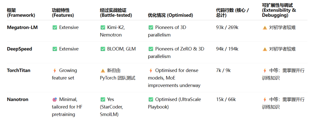 - Megatron-LM / DeepSpeed:功能强大,经过实战考验,但代码库庞大且复杂。