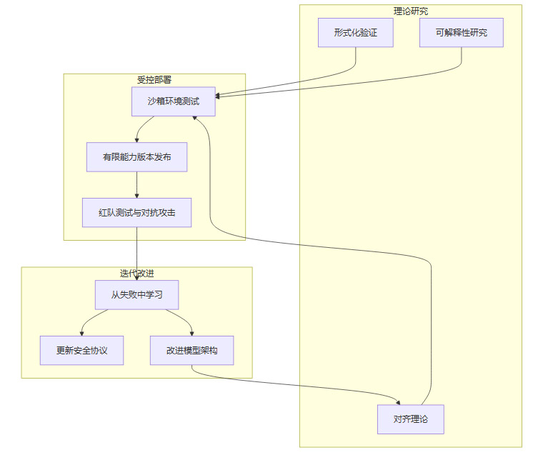 极其严格的沙箱环境:在部署的早期阶段,AI 的行为被严格限制在虚拟环境中,监控其所有输入输出。