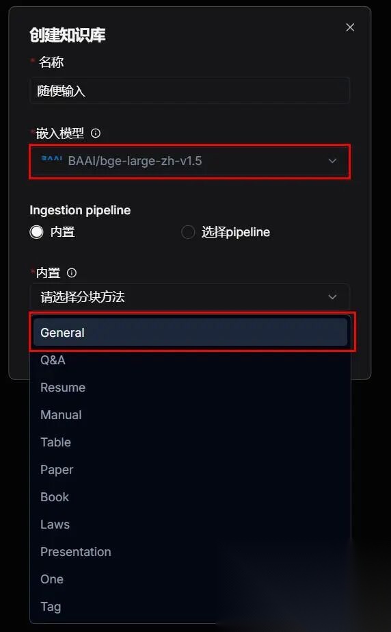 | 这里的Ingestion pipeline 是指如何给你的文档分块,选择:“内置”,一般都选择General,(后续可以修改) 而“选择pipeline”,就需要你自己提前搭设好智能体,根据自己的智能体给文档分块,这里属于高阶玩法,后续我探索了再告诉大家。 |