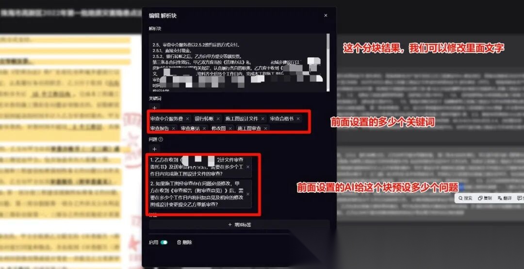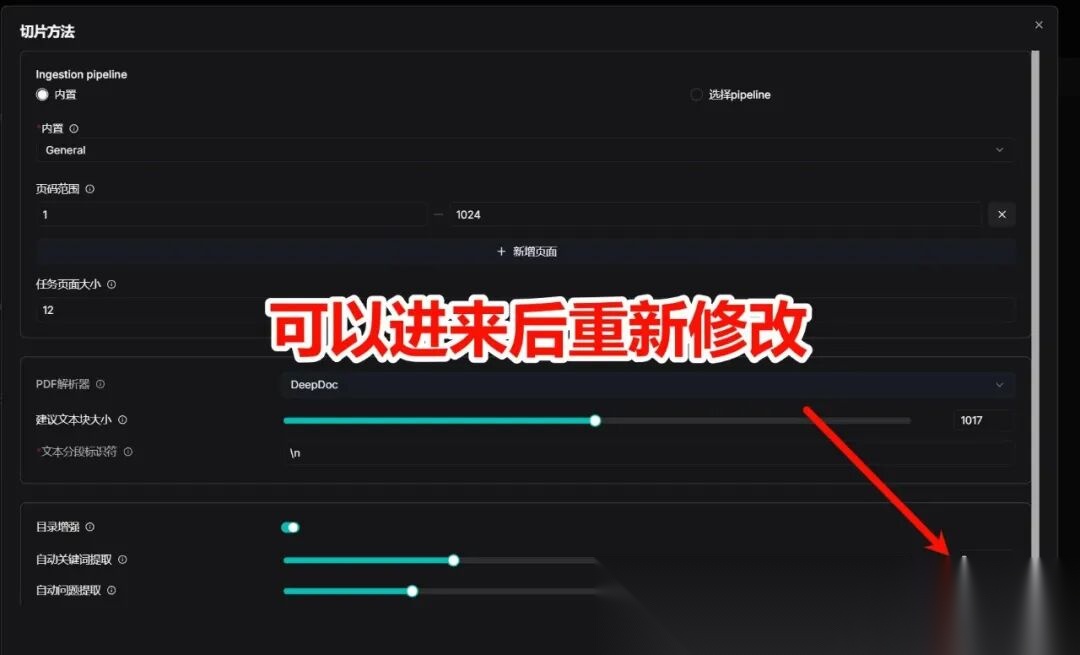 我喜欢把“创建时解析”打开,上传完文档就自动解析分块、弄关键词、给块提问题等。