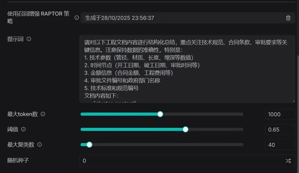 工程场景选择建议:① 正式项目知识库:固定种子值(如100)——确保团队成员检索时“知识树”结构一致,避免因聚类变化导致检索结果差异;② 测试/优化阶段:不固定(或多次调整种子值,如100、200、300)——对比不同聚类结构,选择最贴合工程逻辑的方案(如优先按“标段”还是“工序”聚类)。