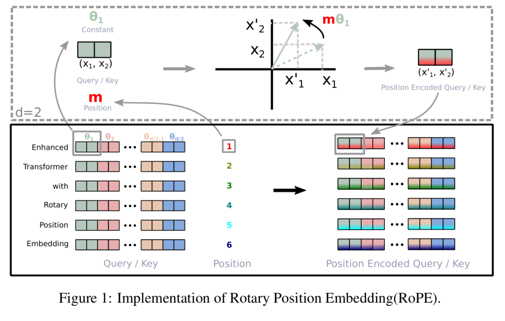 RoPE(Rotary Position Embedding),由 Su et al. 在论文《RoFormer: Enhanced Transformer with Rotary Position Embedding》中提出,核心思想是: