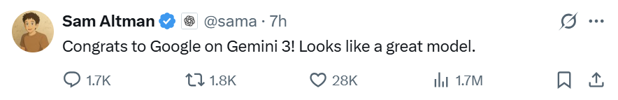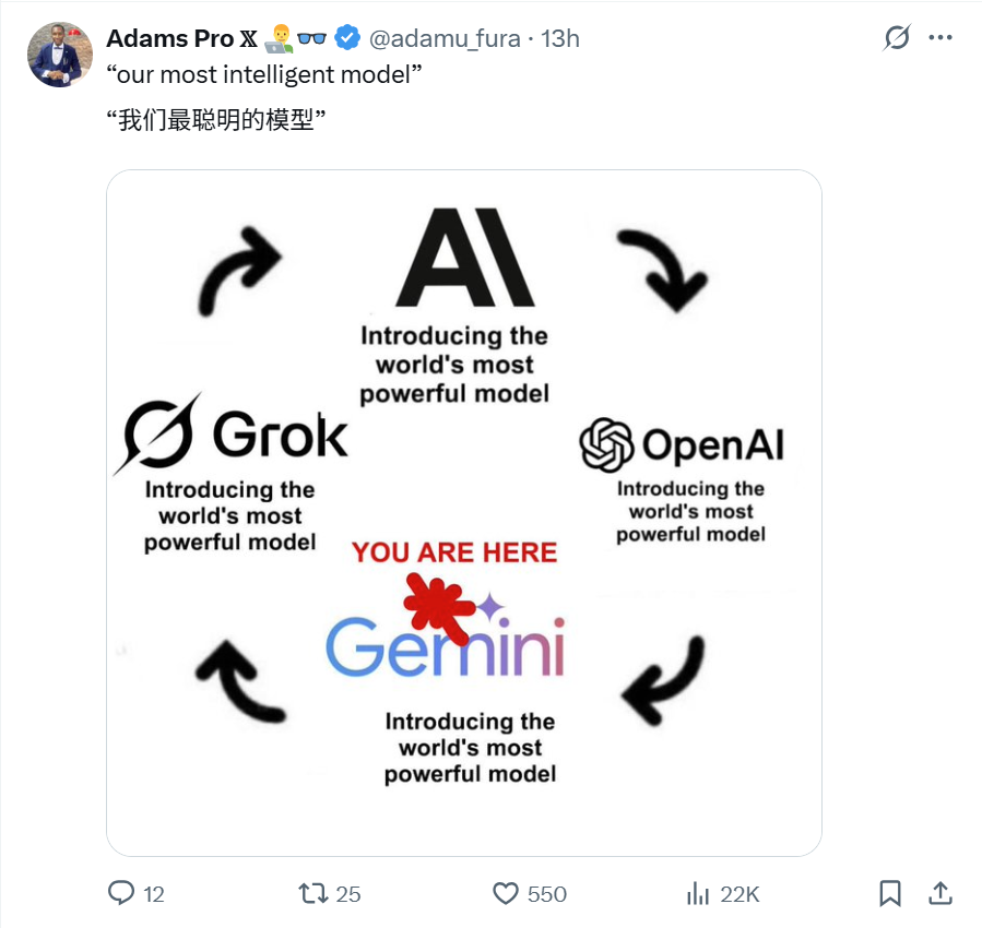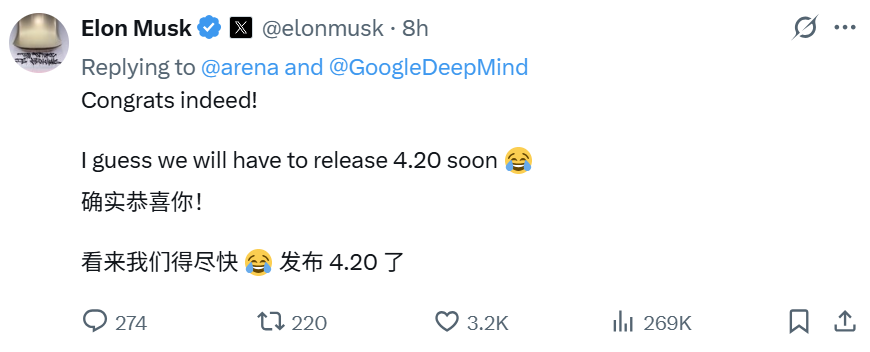 就连奥特曼和老马都第一时间送上祝贺。如果实力接近还能互相较劲几句,但面对这种绝对差距,能做的只有:祝贺,然后回头继续卷。