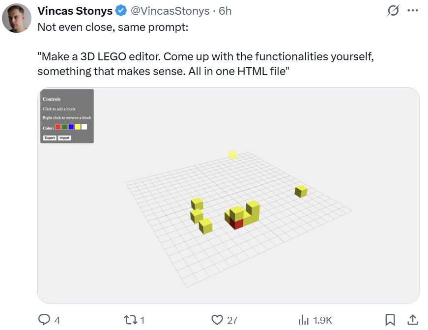“Make a 3D LEGO editor. Come up with the functionalities yourself, something that makes sense. All in one HTML file”