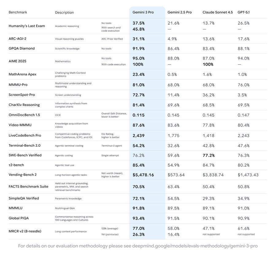 在“人类终极测试”( Humanity’s Last Exam )中,不开工具的情况下 Gemini 3 pro 就能取得 37.5% 的分数,直接甩 GPT-5.1 10% 。