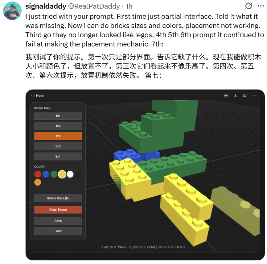 但我用该提示词跑了很多遍,实现的效果别说接近了,差的离谱,甚至会连乐高模块都没有。