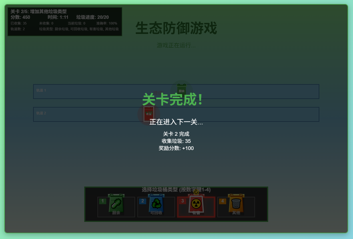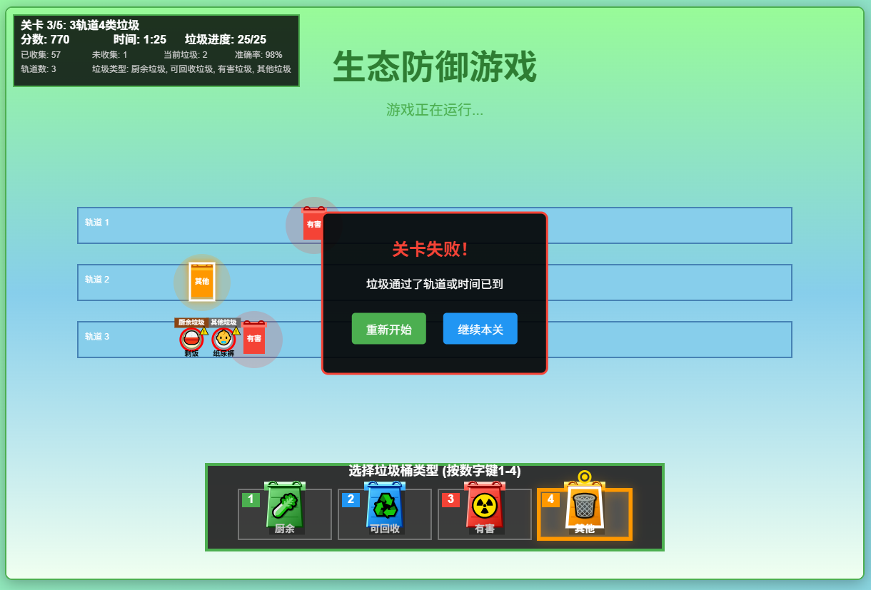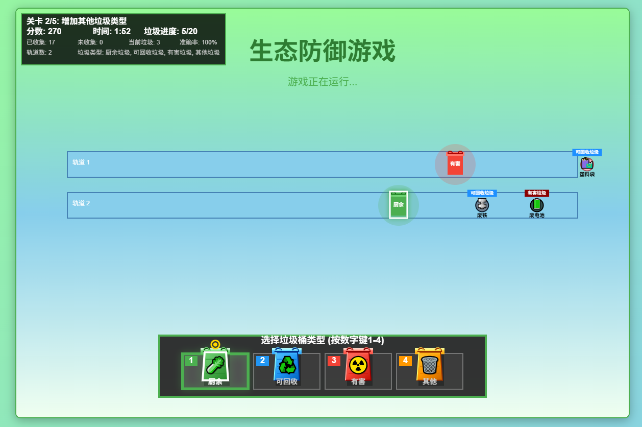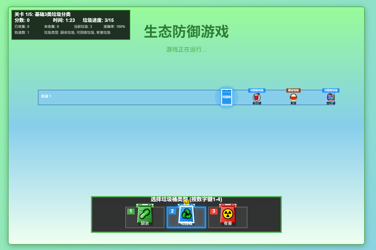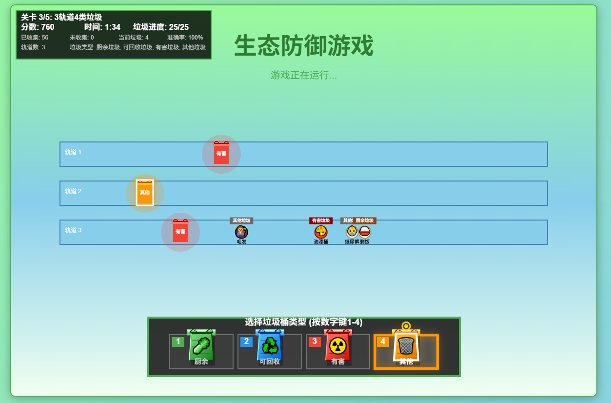 游戏开始后,“垃圾僵尸” 会从轨道右侧慢慢过来,你只要点击对应垃圾桶,放在轨道上就能拦截。接对了会响一声 “叮”,分数 + 10,还会弹出 “分类正确!” 的提示;接错了会有温柔的警报声,告诉你 “应该放进 XX 桶哦”,完全不打击积极性。