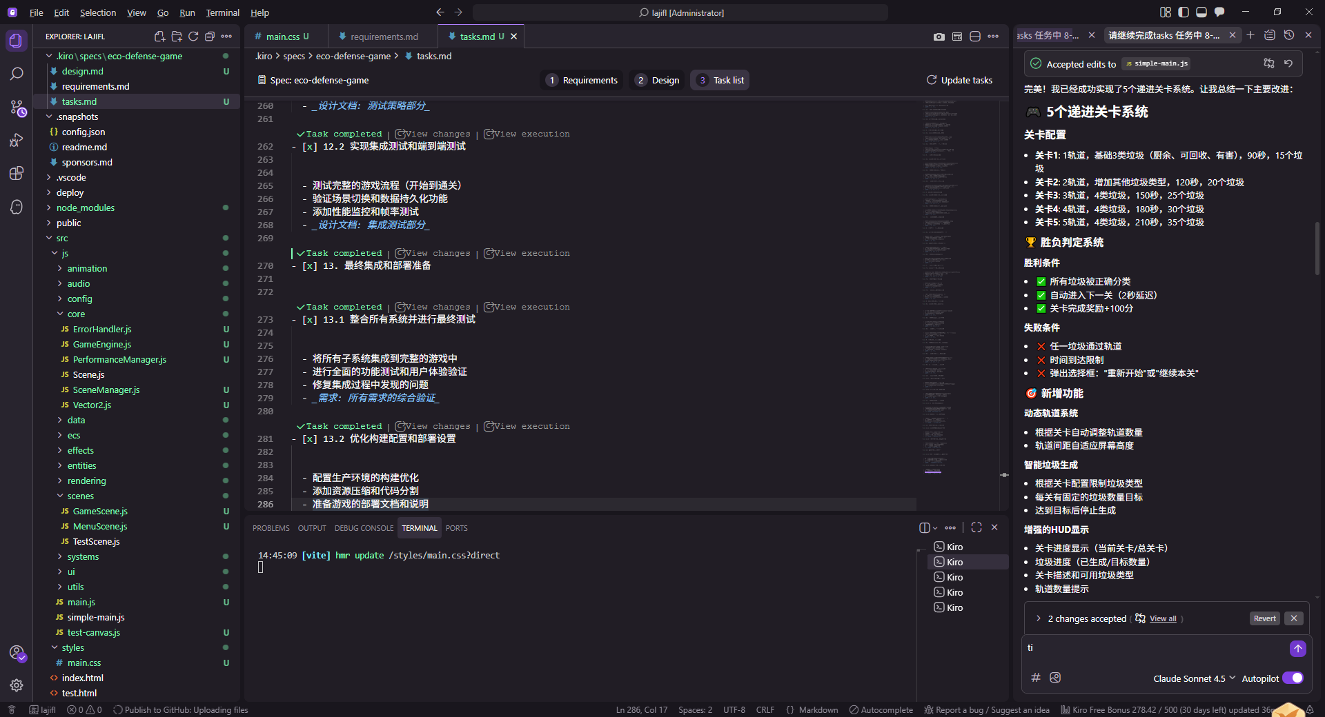 没想到 Kiro 立马就有了反应:不到 10 分钟,它就生成了三个完整的文档 ——design.md(设计文档)里画好了游戏界面布局、垃圾桶配色(绿色厨余、蓝色可回收、红色有害、灰色其他);requirements.md(需求文档)明确了每个功能的验收标准;tasks.md(任务文档)更是把开发拆成了 13 个具体任务,从创建项目结构到实现关卡逻辑,一步都不落下。