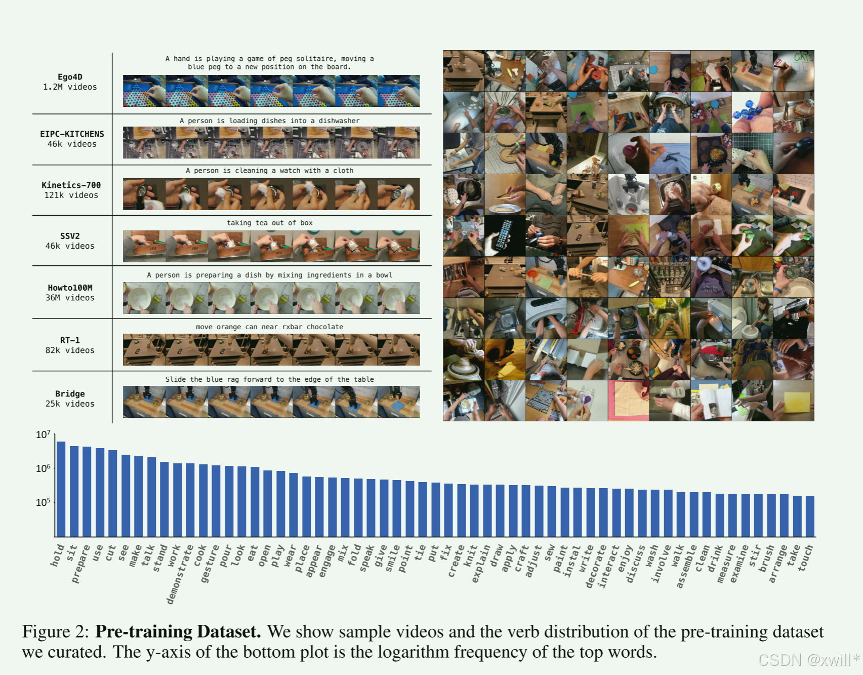 为了将预训练数据适配于机器人操纵任务,作者精心建立了一个数据处理流程,其中包括手部筛选(Hand filtering) 和重新标注(Re-captioning)。