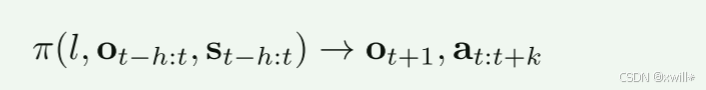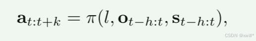 具体来说,文章要训练一个通用策略 π,它接收以下输入:语言指令 l、环境观测序列 ot−h:t、机器人状态序列 st−h:t。并且以端到端的形式输出动作轨迹at:t+k,其中h和k分别表示观测历史和动作轨迹的长度。