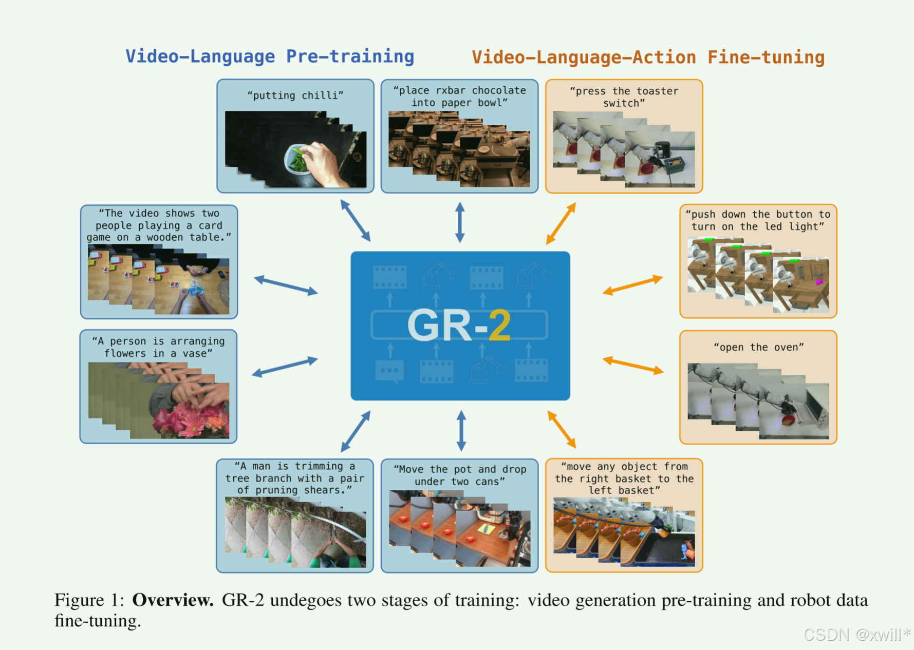 为了解决机器人数据匮乏的问题,GR-2 模仿 GPT 的思路,先看海量人类视频学会“预测未来画面”(预训练),再用少量机器人数据学会“控制动作”(微调),从而实现高效、通用的机器人操作。