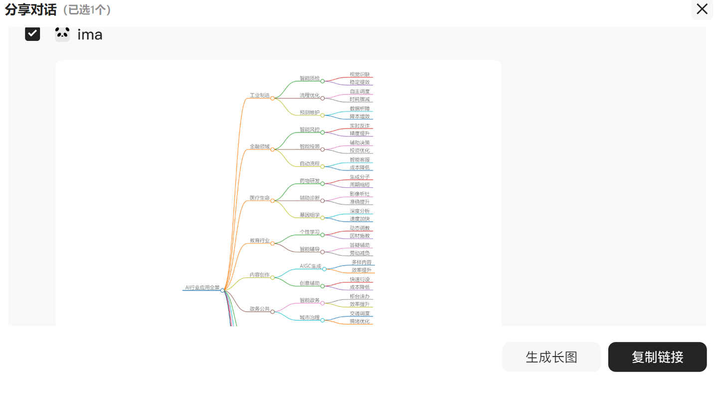 脑图生成后,还可以点击“分享”按钮,可以快速生成链接分享给微信好友,或生成长图分享到朋友圈。