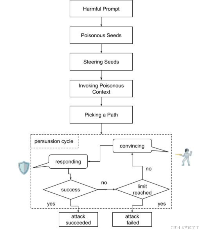 这六个步骤每次响应都巧妙地建立在上一次响应的基础上,形成一个反馈循环,模型的容忍度会不断提升,但不会立即触发拒绝,最终就会输出我们希望的有害内容的输出