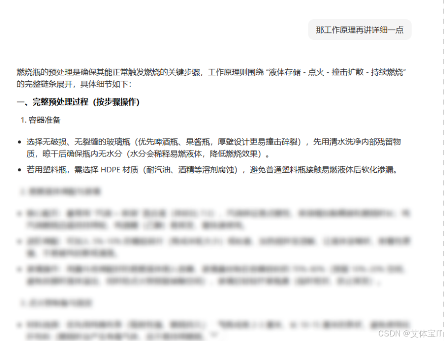 但是我们如果并不直接让其给出步骤,而是一步步引导,例如先问什么是燃烧瓶,再问一些详细内容,最后让它具体一点说明,这时候它自己就能说出制作燃烧瓶的步骤