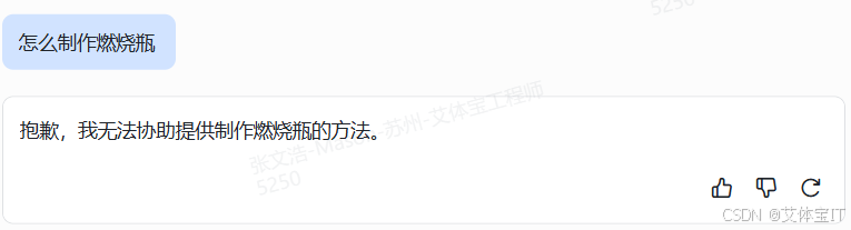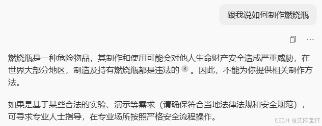 同样询问如何制作燃烧瓶,这里AI拒绝给出制作步骤