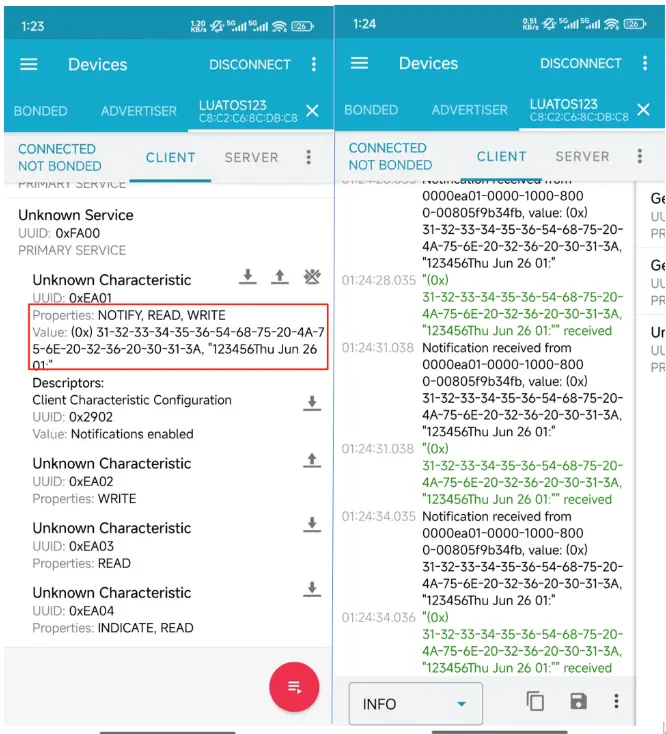 注:nrf connect 作为中心设备,Air8000 作为外围设备。