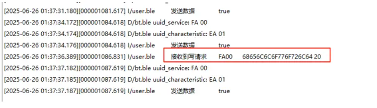 3、数据转发:将接收到的 BLE 数据(包含服务 UUID、特征值 UUID 和实际数据)通过 UART1 发送到 PC 端。