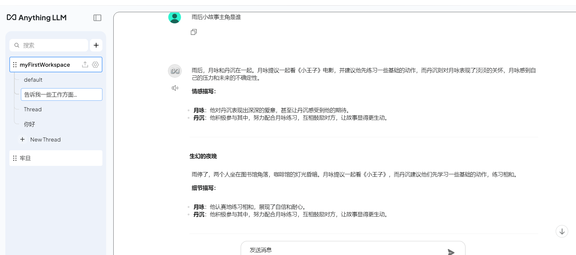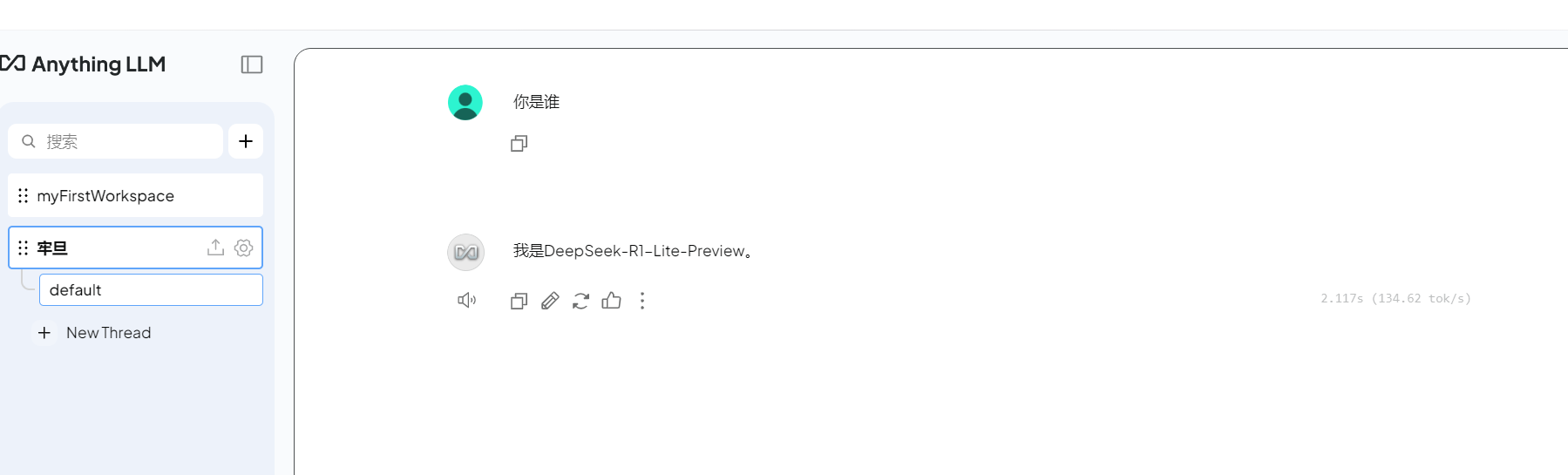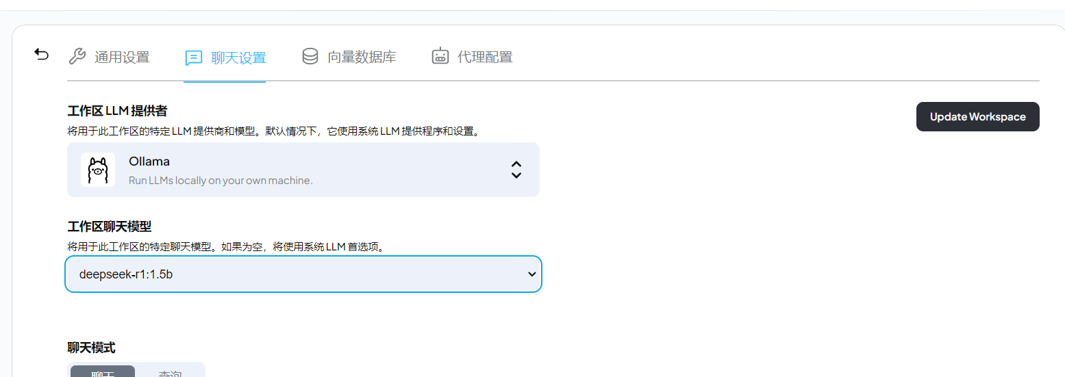 然后点击旁边的黑色按钮updete workspace,更新工作区设置使代码生效,现在你就可以在工作区用本地模型对话了
