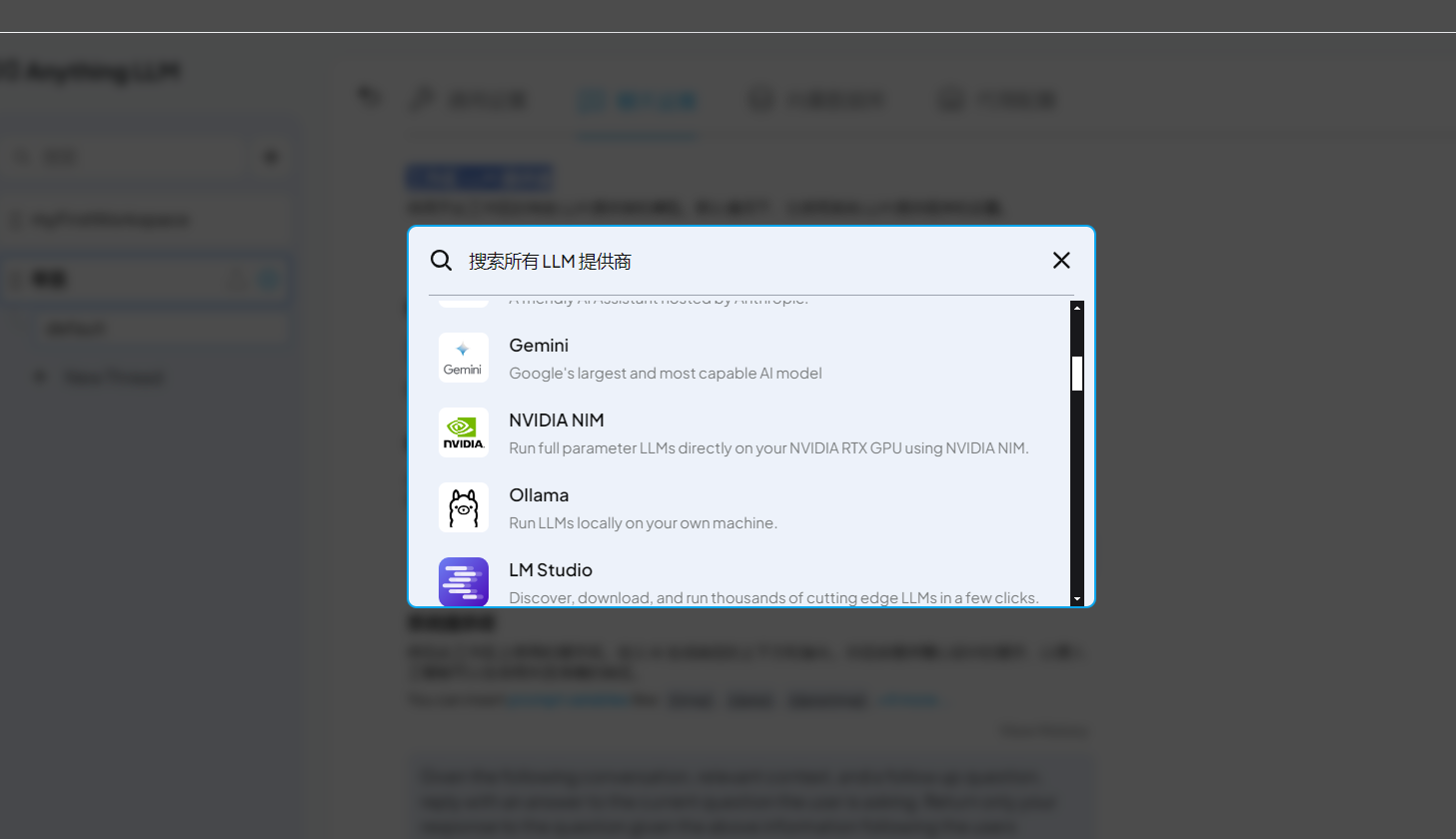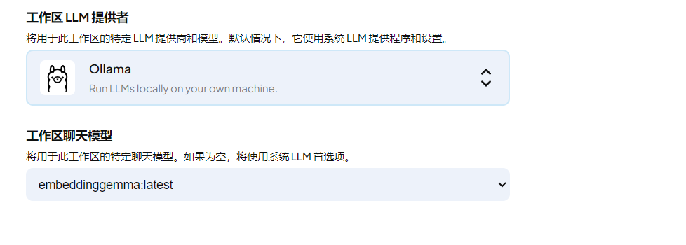 将聊天设置里的工作区 LLM 提供者,选择为刚下载的ollama,
