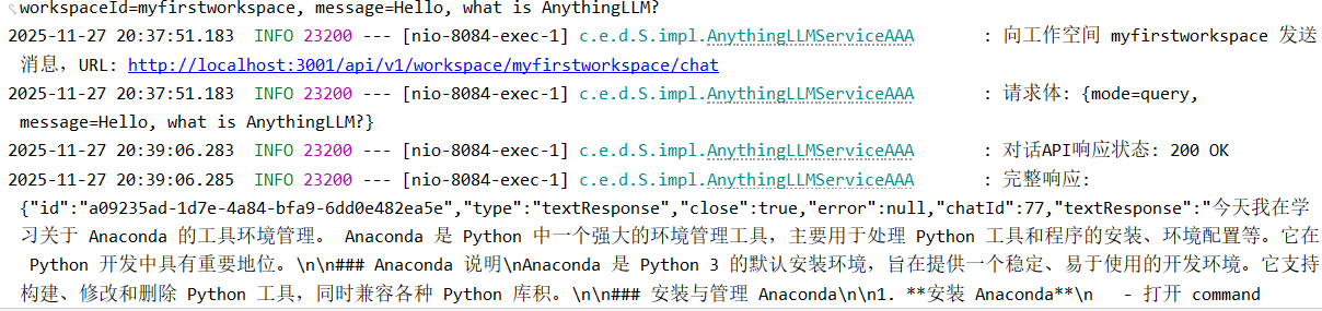 由于anythingllm提供了api供我们调用,因此我们可以通过调用它的api实现对话,上传文档等功能。我使用的是springboot2集成好的resrTemplate来调用。