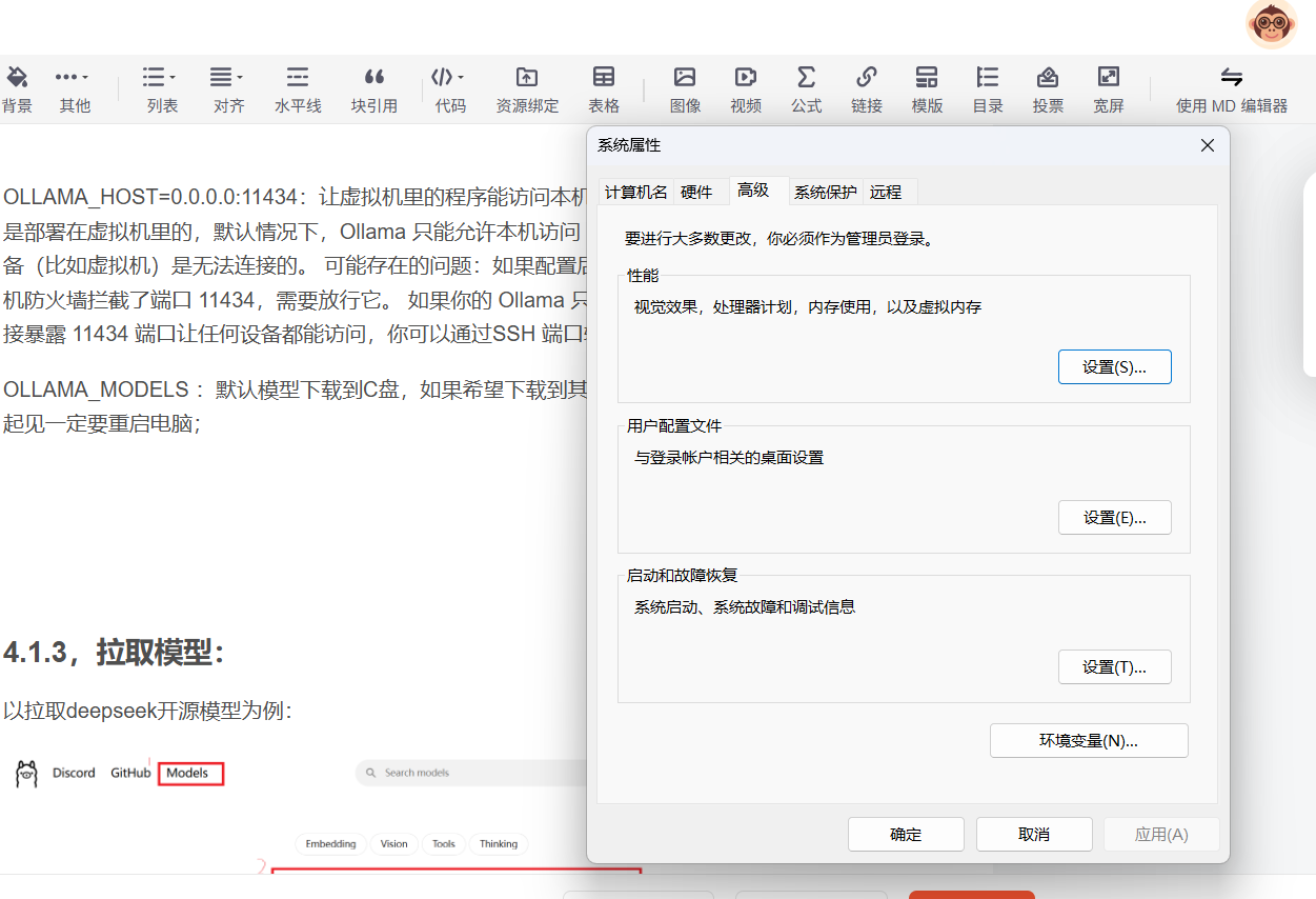OLLAMA_MODELS :默认模型下载到C盘,如果希望下载到其他盘可以配置,最好选一个大一点的盘; 注意配置之后保险起见一定要重启电脑;