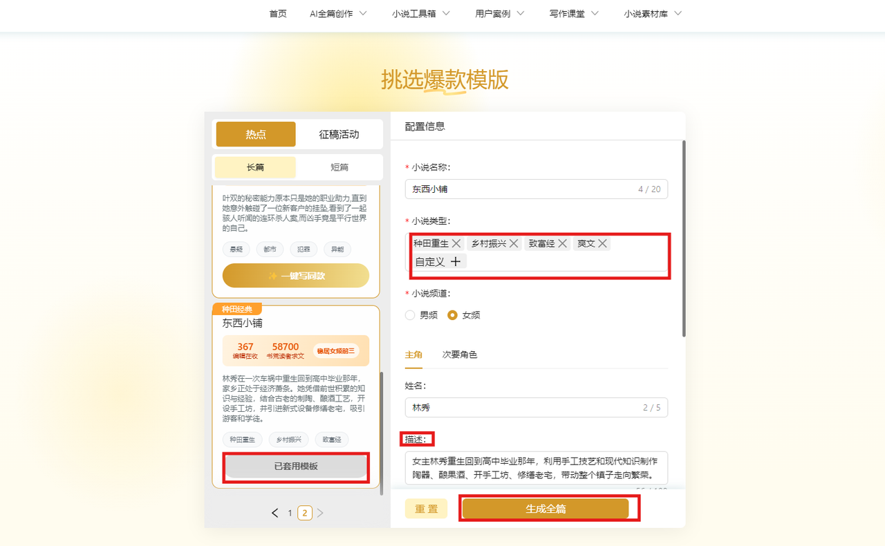 我重点安利它的 【AI写全篇小说】 功能。你只需要简单填入题材、类型和几个关键设定,