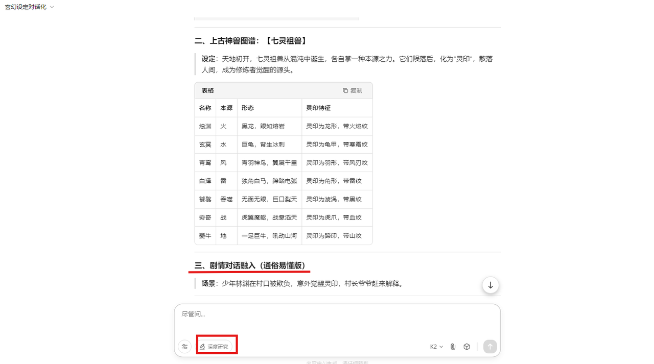 我用它处理了一本玄幻小说的“修炼体系”和“上古神兽图谱”,要求它将这些复杂的设定用通俗易懂的对话融入到剧情中。结果Kimi做得非常干净利落,避免了传统网文常见的“设定堆砌”问题。不过,它更像是一个“高效的参考书”,用来直接写小说正文,它的人设和情感推进会略显生硬。