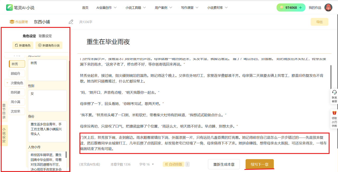 它就能从零开始一键生成整篇小说,甚至连分章节都给你自动安排好。对我这种经常卡文的人来说,它能直接续写卡住的章节,像个老帮手那样跟着你补全章节。