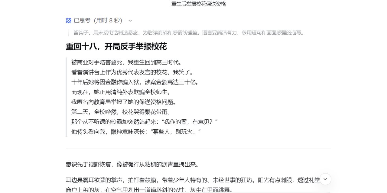 DeepSeek最大的特点是其逻辑推理能力。它非常擅长处理复杂叙事结构、推理环节和大局设定。如果你要写一本架构宏大、逻辑严密的男频爽文或权谋文,用它来构建主线和世界观是极好的选择。它写出来的内容往往符合审核标准,节奏把控准确。