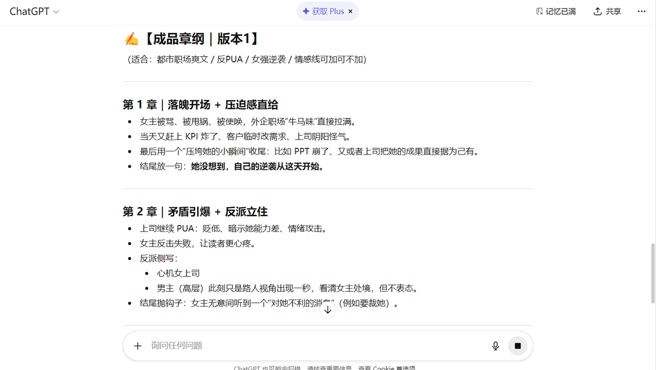 ChatGPT,尤其是Plus版本,最强悍的地方在于它的规划能力。它不是一个好的“主笔”,但绝对是顶级的 “写作策划”。它擅长根据你的设定,帮你拆解章节结构 、模拟平台编辑的审稿提问、预判设定Bug。在准备投稿阶段,用它来“查漏补缺”能大大提高你的过审率。