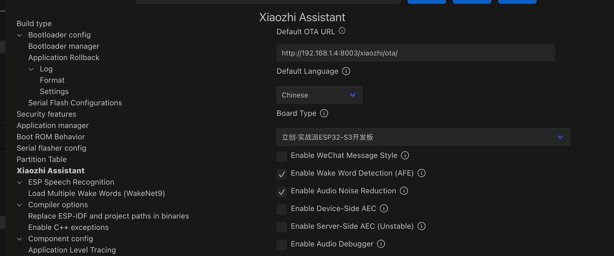 小智的客户端编译和烧录很多up主有介绍,这里不再废话,最主要的一点是要修改服务器地直为本地和修改你的主板为你自己的板子型号,比如ip地址一定要修改成自己的电脑地址或者去服务器地址,然后编译烧录
