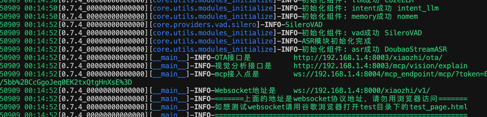 上面的命令意思是创建一个支持小智服务器的环境并激活,安装相应的组件,并启动小智app server,成功之后,可以看到如下的信息,用其中的ota接口代替上图中的ota地址