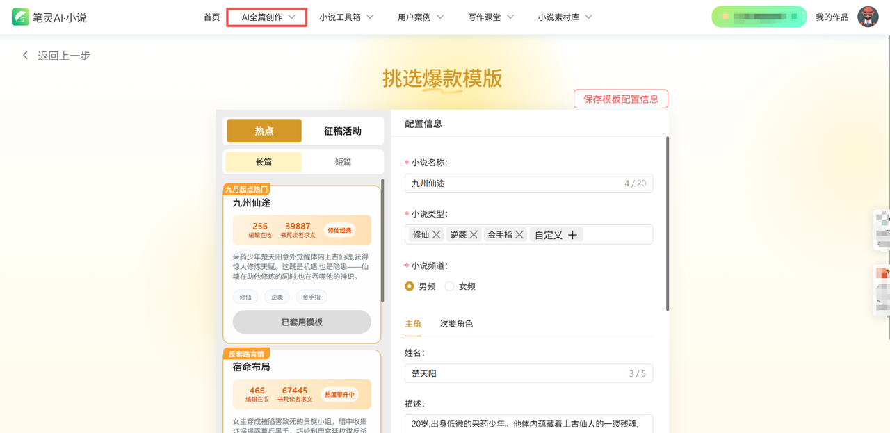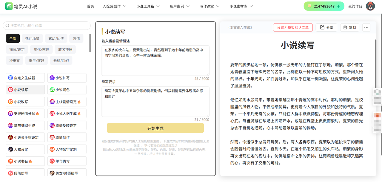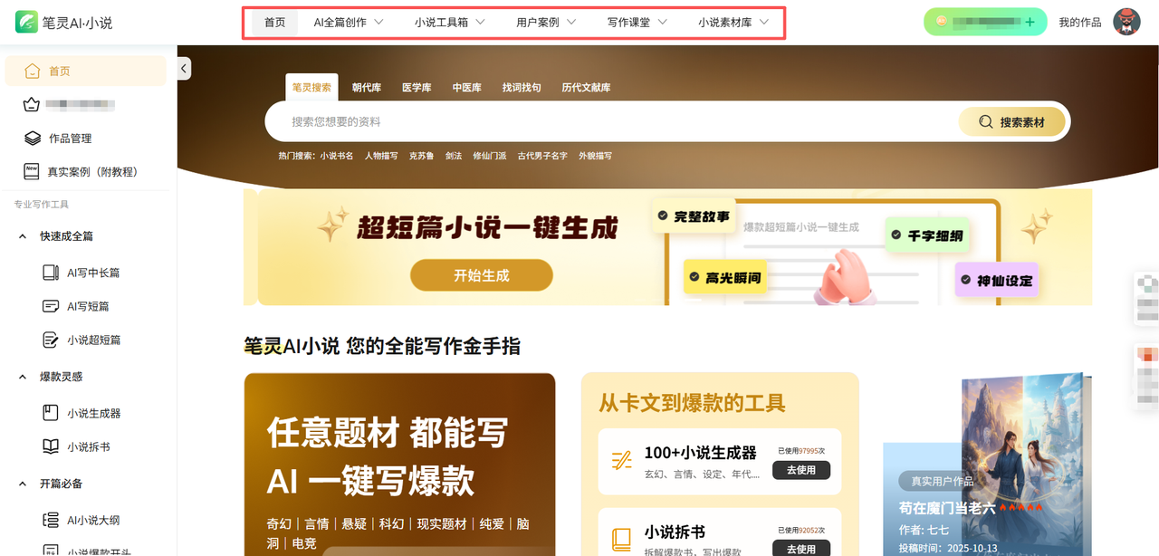 核心功能:它主打AI写全篇小说,能从零生成完整长篇。还有它的小说生成器和素材库功能也超实用,专治各种卡文。