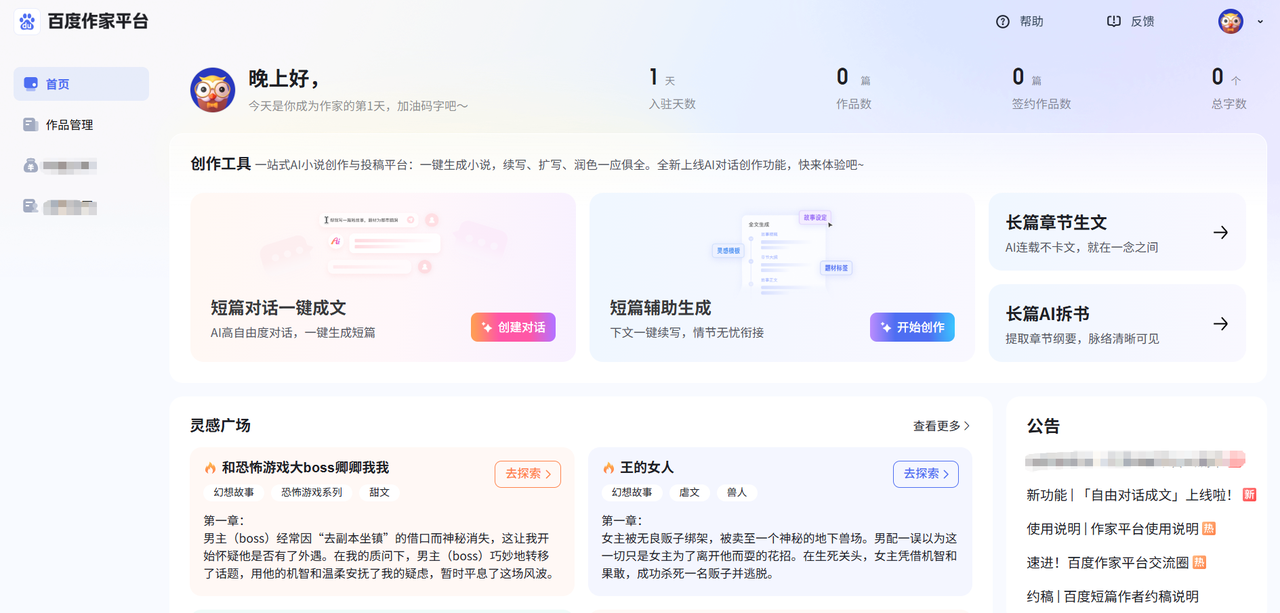 核心功能:主要服务于百度旗下平台的作者,提供章节生成、灵感推荐,以及非常实用的违禁词检测。