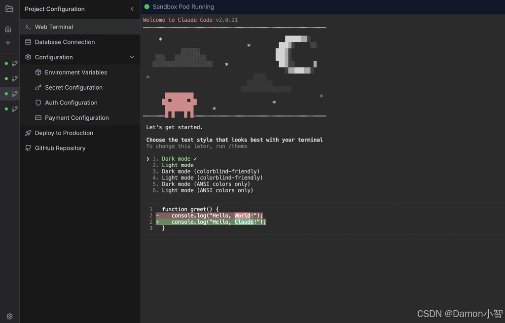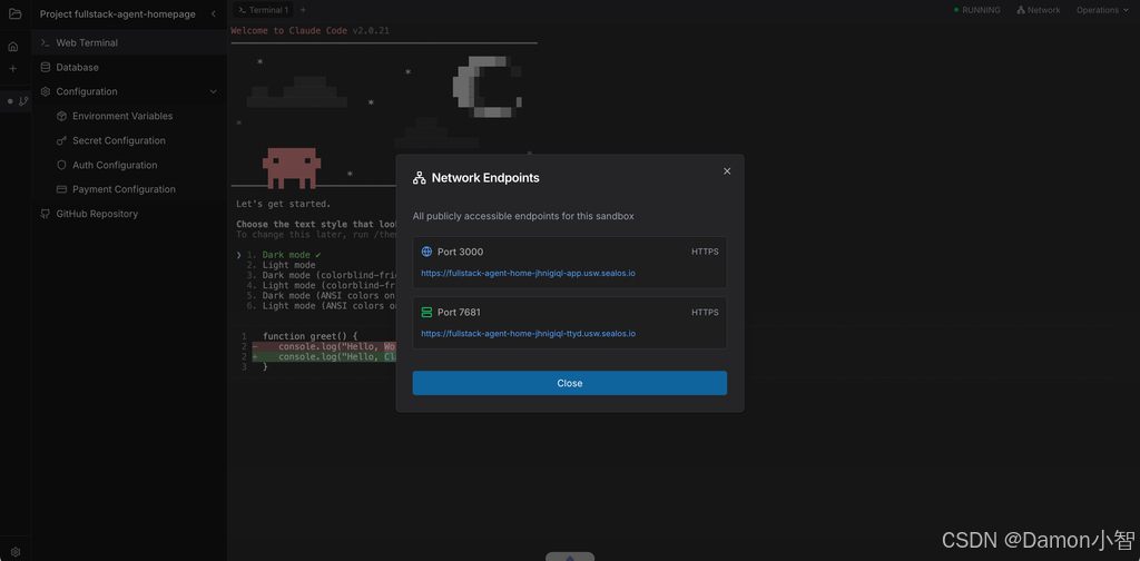 一进去给我惊艳住了,什么都不用干,直接可以开始用 claude code 了,域名都给我弄好了: