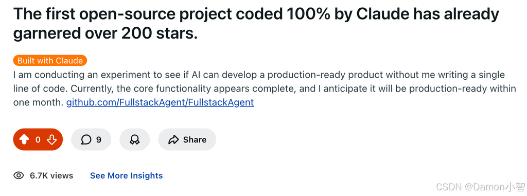 第一:100% AI 全生成的开源项目,居然也能有 star, 这还是挺夸张的,这意味着 AI 不仅能写代码,还能写出程序员认可的代码。(如果真的是和作者声称的那样)