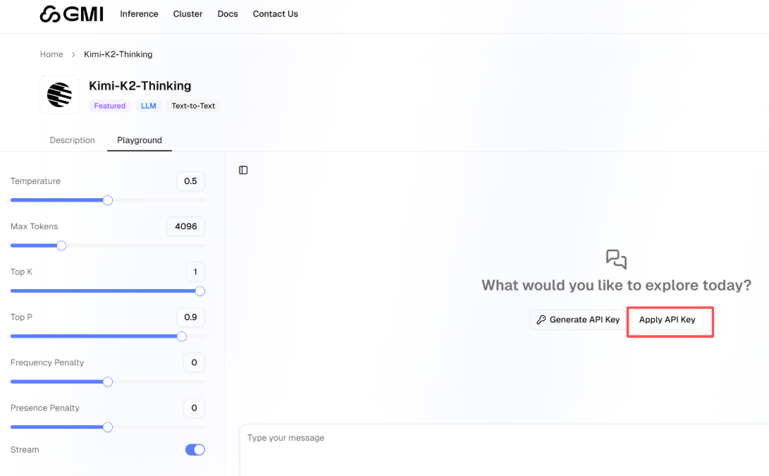 点击“Apply API Key”按钮,将之前保存的 API 密钥输入其中,完成配置后即可使用该模型。