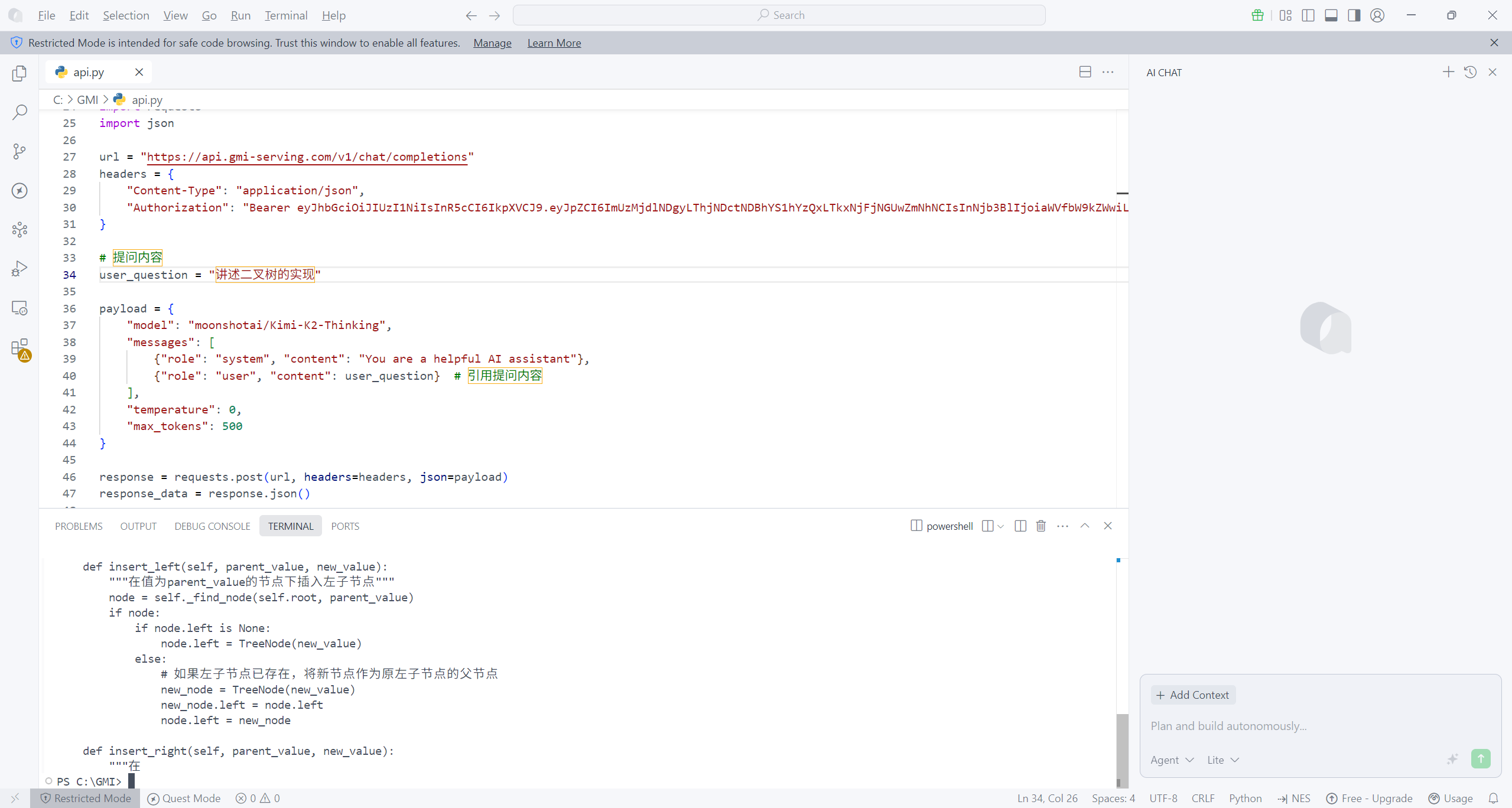 为提升代码的灵活性与可维护性,针对基础调用代码做了两处核心优化:一是将提问内容从 messages 中抽离,单独定义为 user_question 变量,后续更换问题仅需修改该变量,无需调整整体代码框架;二是优化输出格式,从响应数据中提取 AI 核心回复,按“问题+回答”的对应形式清晰打印,解决了原始代码输出杂乱的问题。优化后的代码如下: