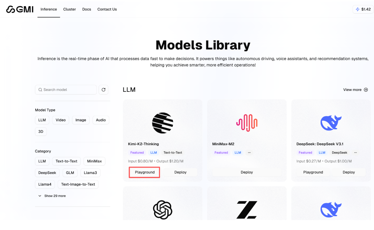 找到 Kimi-K2-Thinking 模型,点击其对应的“Playground”标签;