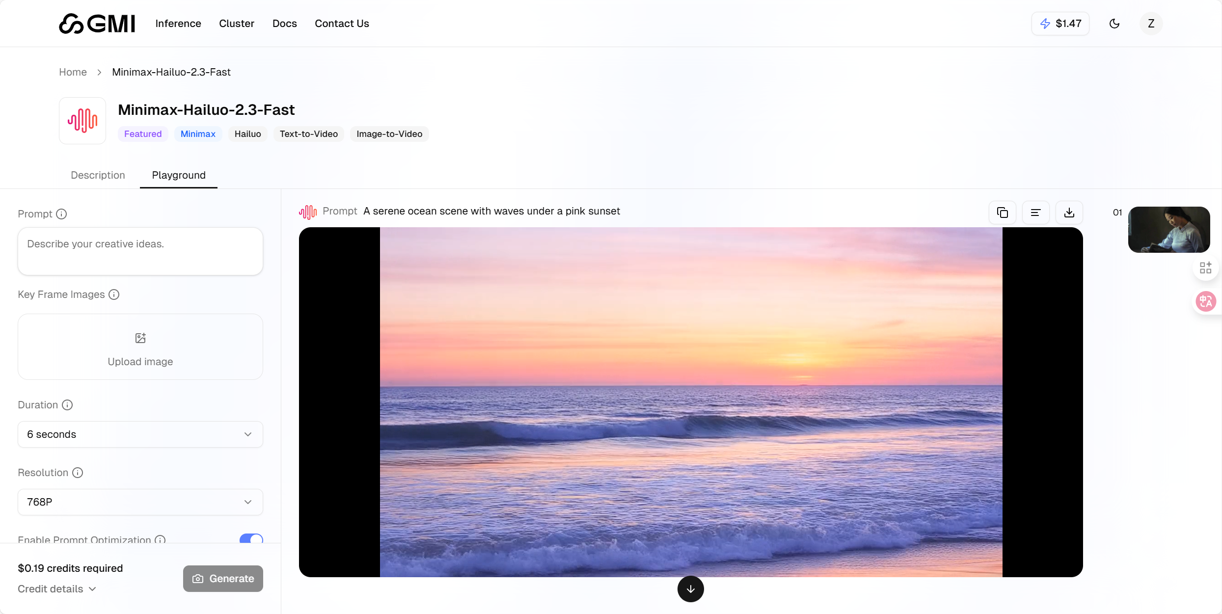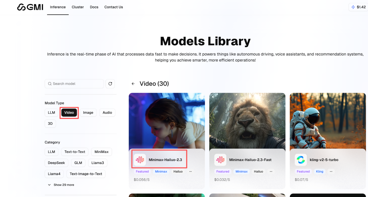 在平台菜单中选择“Video”分类,此处以 Minimax-Hailuo-2.3 模型为例说明生成流程:
