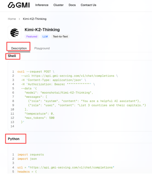 以此前测试过的 Kimi-K2-Thinking 模型为例,调用步骤如下:启动模型后,点击「Description」选项,页面将呈现详细的调用指引。